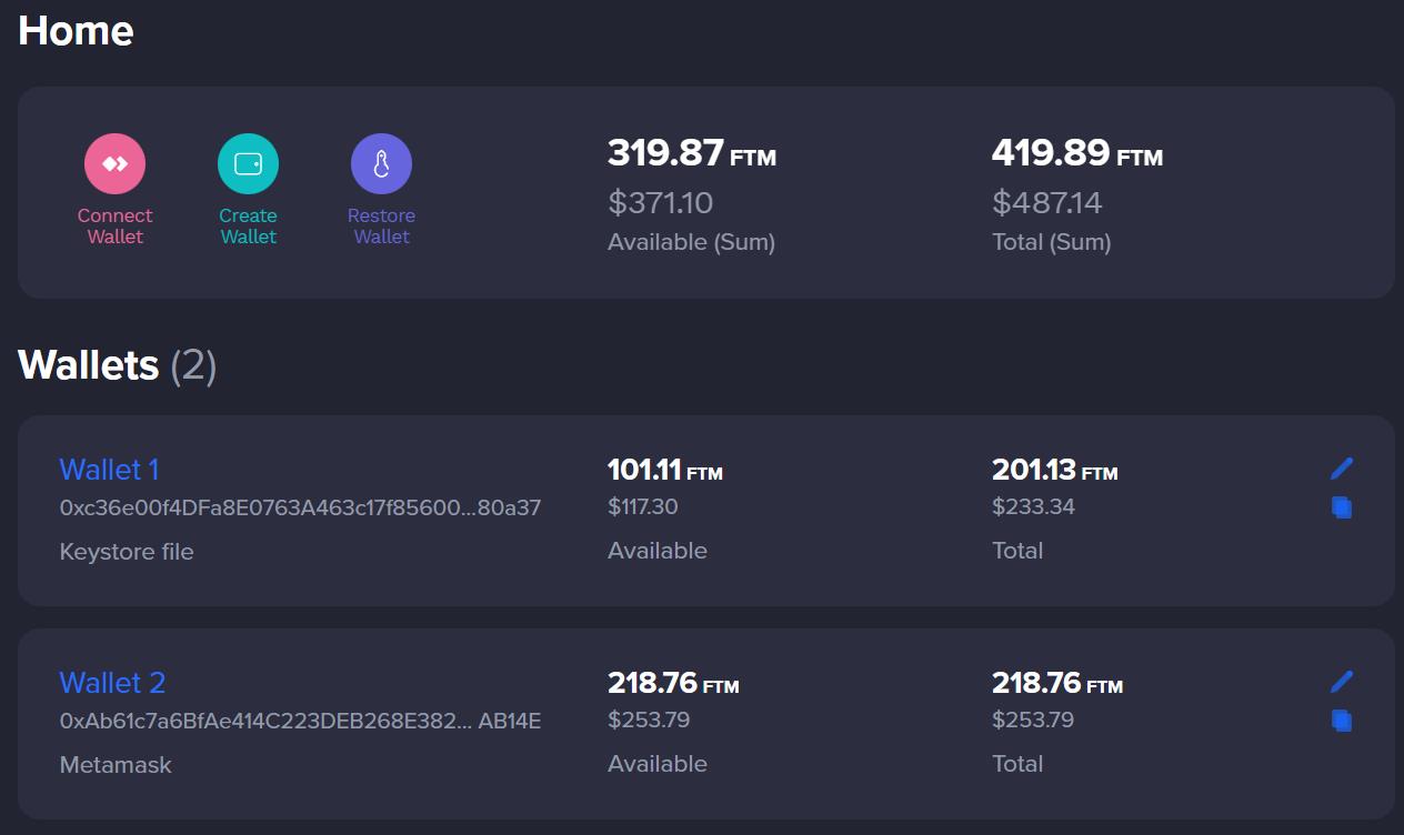 You can now see two wallets on your homepage. One is linked with a Keystore file and the other with Metamask with desired $FTM token balance.