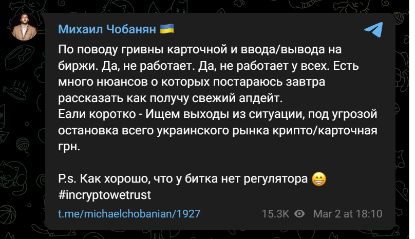 “Regarding the hryvnia card and input/output to the exchange. Yes, it doesn’t work … We are looking for ways out of the situation, under the threat of stopping the entire Ukrainian crypto/card UAH market [translation].”