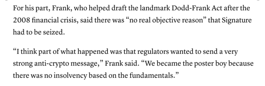 The seizure came despite claims by Signature board member Barney Frank that the bank was solvent.