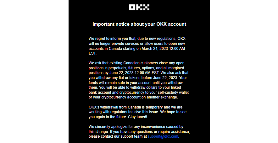 On March 20, OKX crypto exchange informed its Canadian users through email that the company: