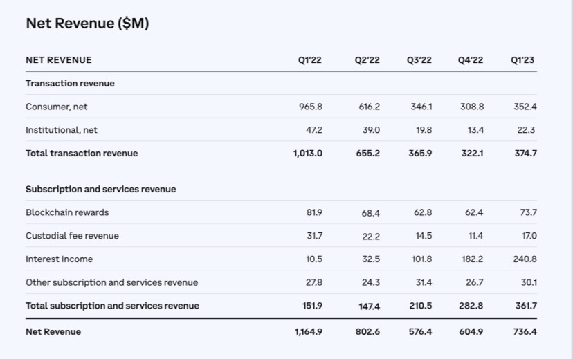 Interest income and blockchain rewards from staking brought in the most revenue for the quarter, which increased to $240.8 million and $73.7 million respectively from Q4 2022.