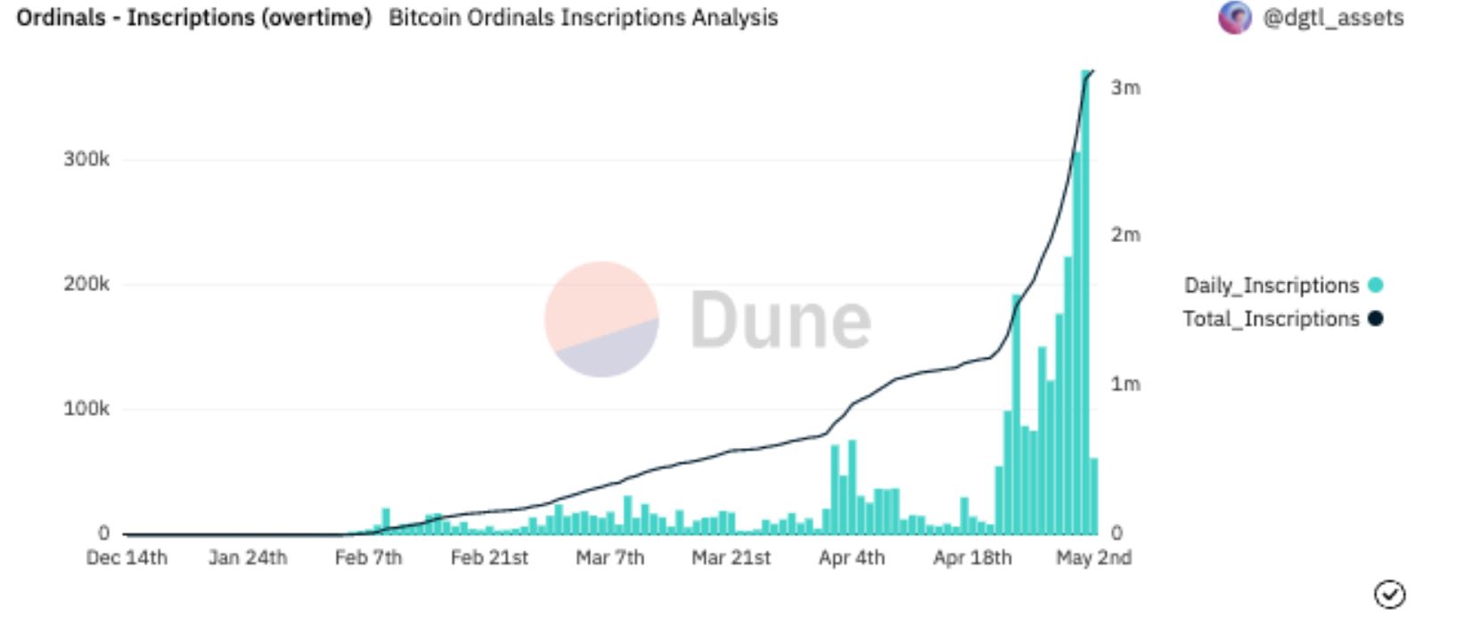 According to recent data, inscriptions of Bitcoin ordinals have been on the rise in recent months. On April 2, Bitcoin ordinals reached 58,179 inscriptions — up 83.5% from the previous month. However, on May 1, the total number of Bitcoin ordinal inscriptions skyrocketed to exceed 3 million.