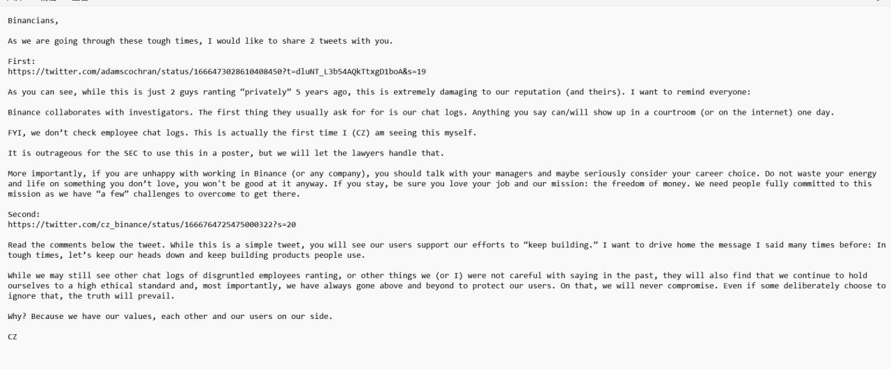 CZ’s letter, which was exclusively obtained by Odaily Planet Daily, emphasized Binance’s commitment to transparency and cooperation with investigators. He clarified that Binance does not monitor employee chats and expressed his surprise at the SEC’s use of such chats as evidence, calling it “absurd.”