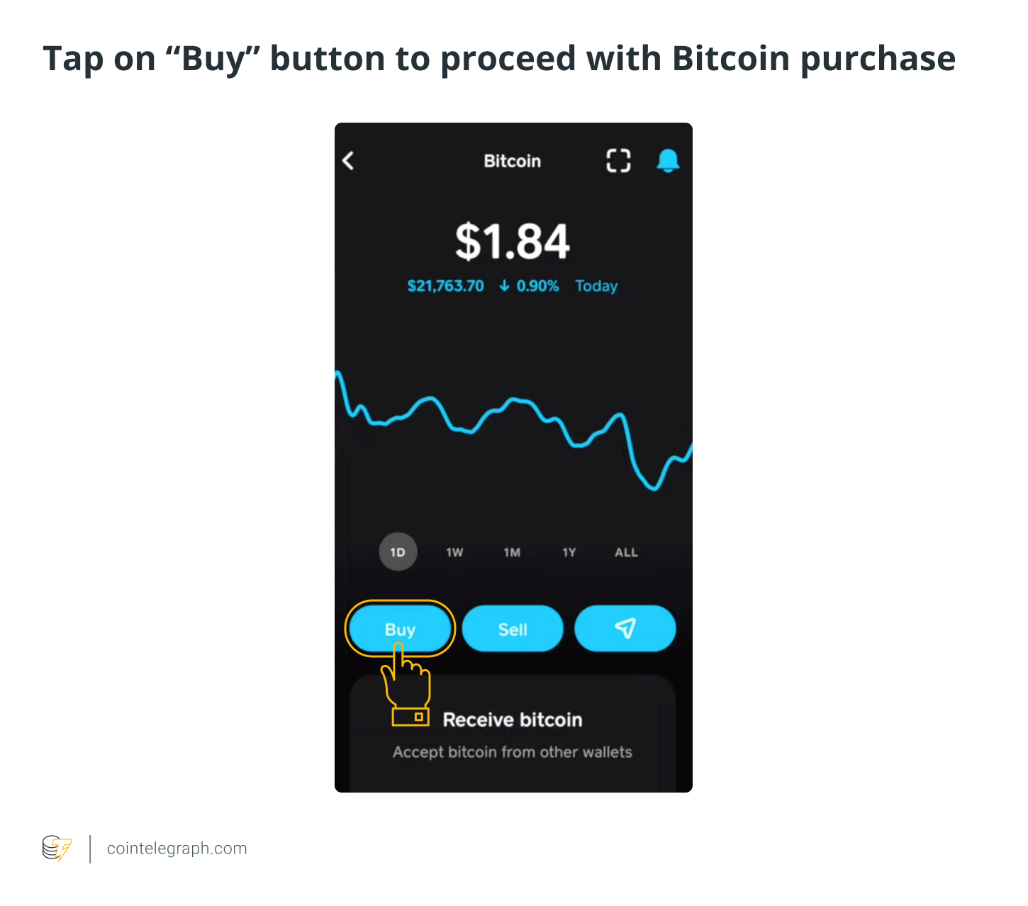 - Access the “Bitcoin Investing” screen and tap “Buy.”