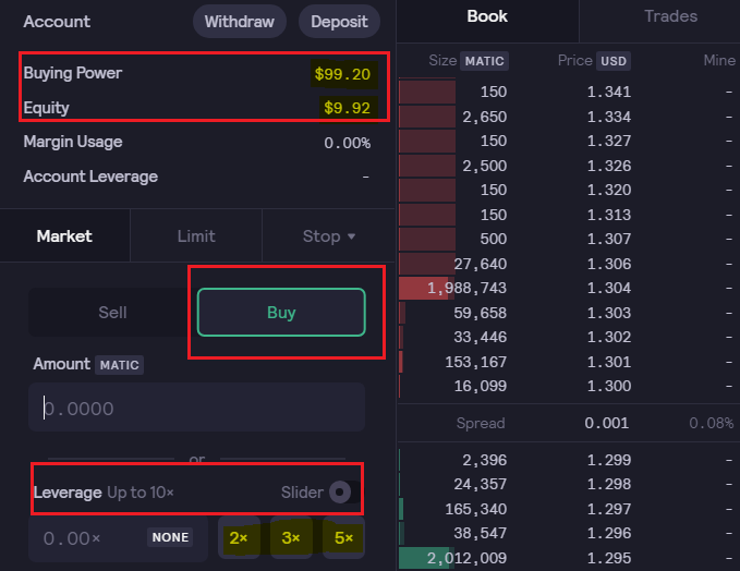 $24.66 buying power equates to a position size of 19 MATIC tokens at an index price of $1.30 per MATIC.