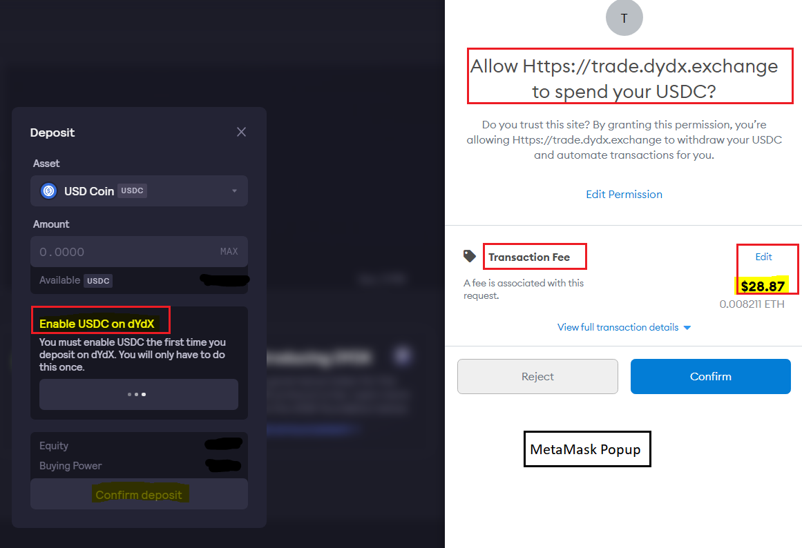 When you add USDC to dYdX for the first time, you must enable spending through your wallet. This allows dYdX to spend USDC from the wallet with the project’s smart contract. Approving the transaction requires paying a gas fee in ETH.