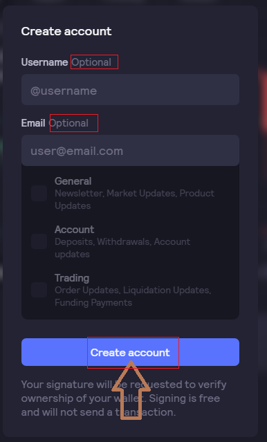 After agreeing to the terms, dYdX asks you to create an account with an optional username and email address. To sign up without adding a username or email address, skip and click on “Create account.” A popup will then appear in your wallet to request a wallet signature. Signing this request gives access to enter dYdX.