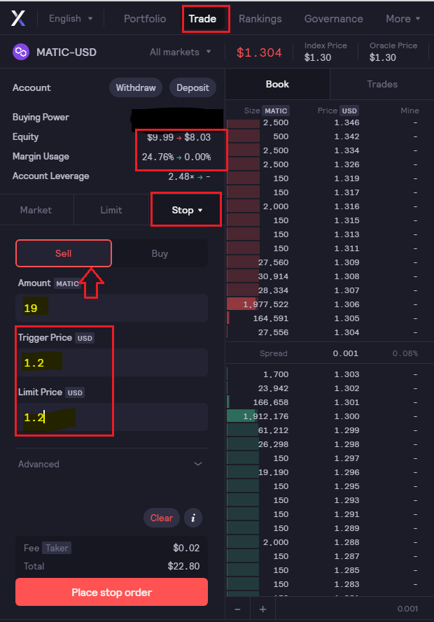 You can place a short sell after selecting “Stop” under the Trade tab. In the example above, Crypto Briefing selects a stop price of $1.20, 7.6% below the original entry price.