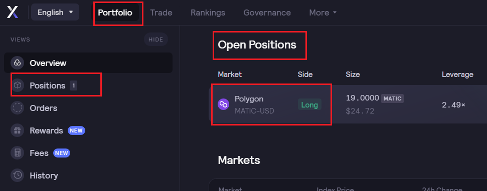 As the trade was a market order, it was immediately filled. The “Portfolio” tab shows all open positions, in this case long 19 MATIC with 2.49x leverage.