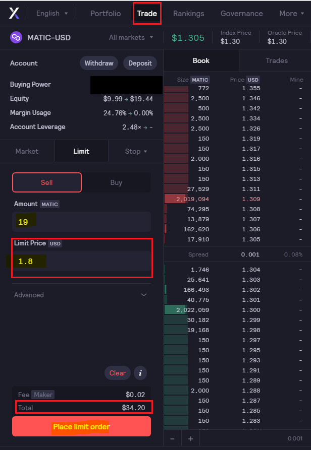 To do this, go to the “Trade” tab and place a limit order to sell the asset, in this case 19 MATIC. Select a Limit Price. In the example above, Crypto Briefing selects a price of $1.80 per MATIC.