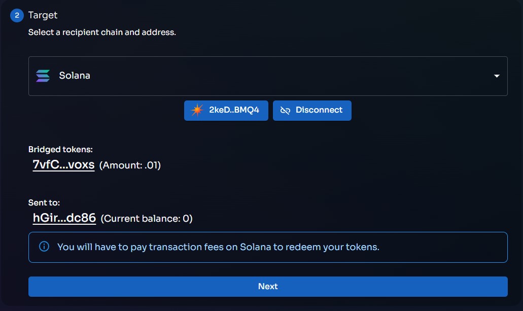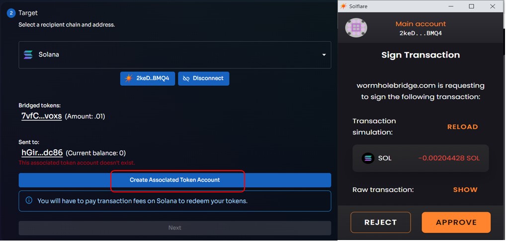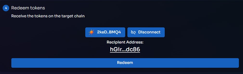 Then, you have to redeem it to transfer the tokens from the wormhole bridge to the destination wallet address in Solana.