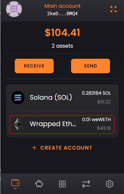 As a result, once done, you can see the wrapped Ethereum (WETH) token balance in your Solflare wallet.