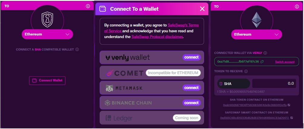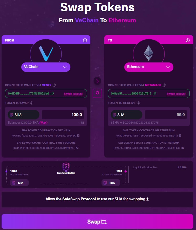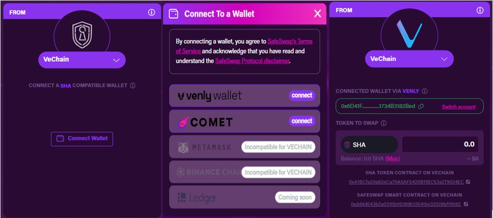 Users can perform the swap activity among the Ethereum, Binance Smart Chain (BSC), and VeChain networks. SafeSwap also allows you to perform the activity using multiple wallets like Venly, MetaMask, and Comet.