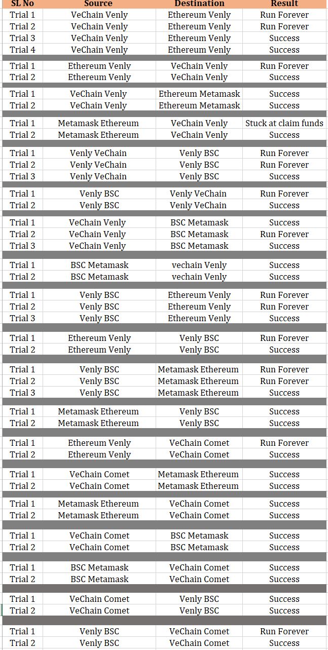 We have done extensive testing and have captured the results. We have found the use case is pretty impressive. However, there is still a lot of improvement that needs to be done. We have figured out that the swap activities between different networks with Venly wallet (source and destination wallet as Venly) weren’t going through well and were getting stuck at the swap protocol. The transfer between Venly, MetaMask, and Comet wallets with different networks was almost smooth. Once these small issues are rectified, the project can make big in the future.