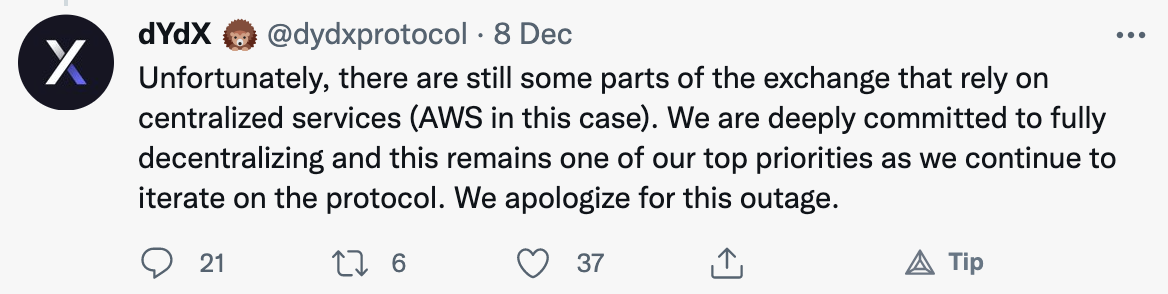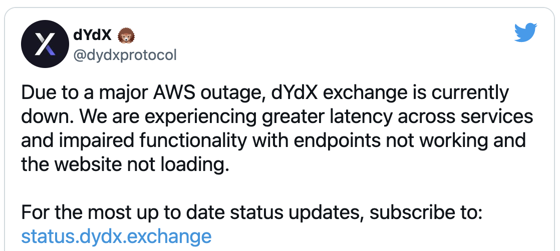 DyDx tweeted an admission later that highlighted the problems they were experiencing with their reliance on AWS’ centralised services.