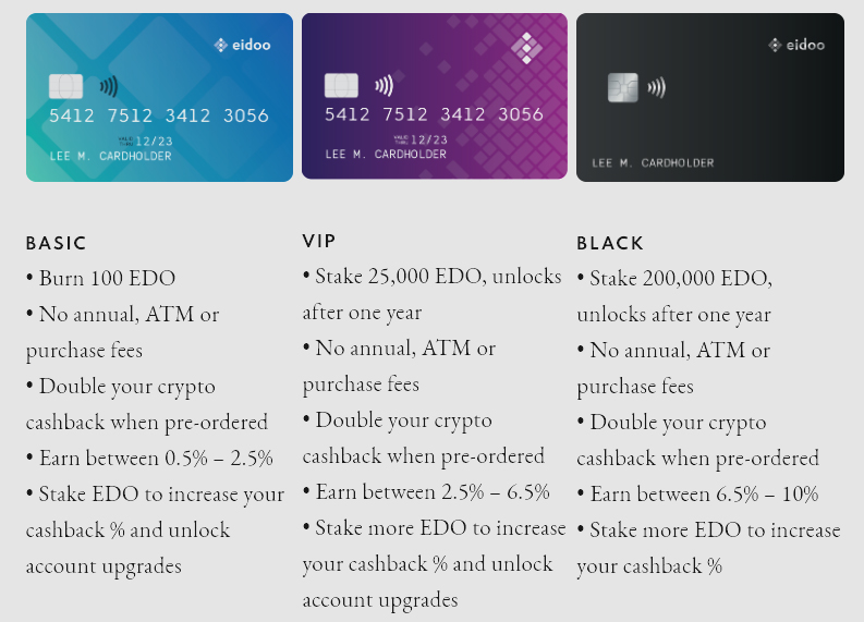 There are three types of accounts available for the Eidoo Card; Basic, VIP, and Black (metal).