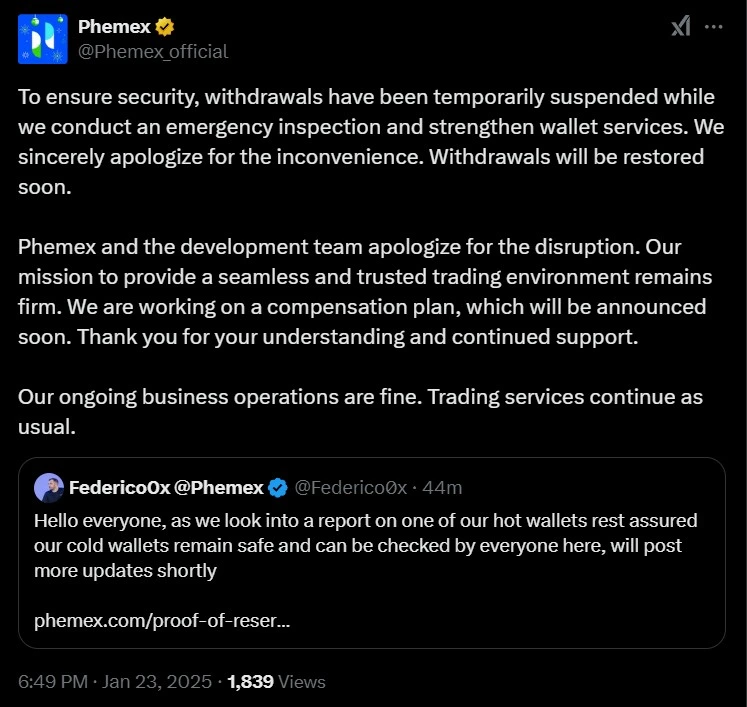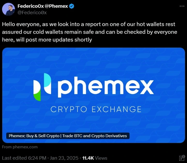 Phemex CEO, Federico Variola, also addressed the issue on his X account. In his tweet, he explained that there has been an issue with one of their hot wallets due to which this suspension of services protocol has been initiated. He also assured that the other wallets which offline wallets or the cold wallets, are safe and secure. The safety of the offline wallets or the cold wallets can be verified online with a link that the CEO provided. He promises to keep the users updated as the investigation continues to proceed and unfold.