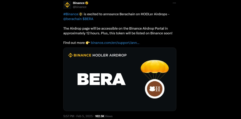 Binance has announced Berachain (BERA) to be the latest addition to the HODLer Airdrops program. This news was announced right after Berachain’s announced its mainnet launch date. As per the announcement, eligible Binance users who subscribed to Simple Earn products with their BNB holdings from January 22 to January 26, 2025, will receive BERA tokens through the airdrop.