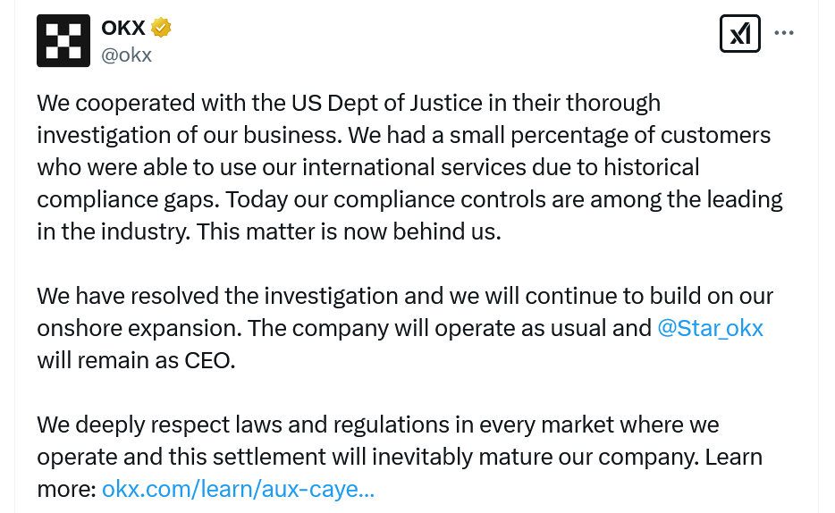 The Seychelles-based crypto exchange emphasized that no customer harm was alleged, and no charges were filed against any OKX employee.
