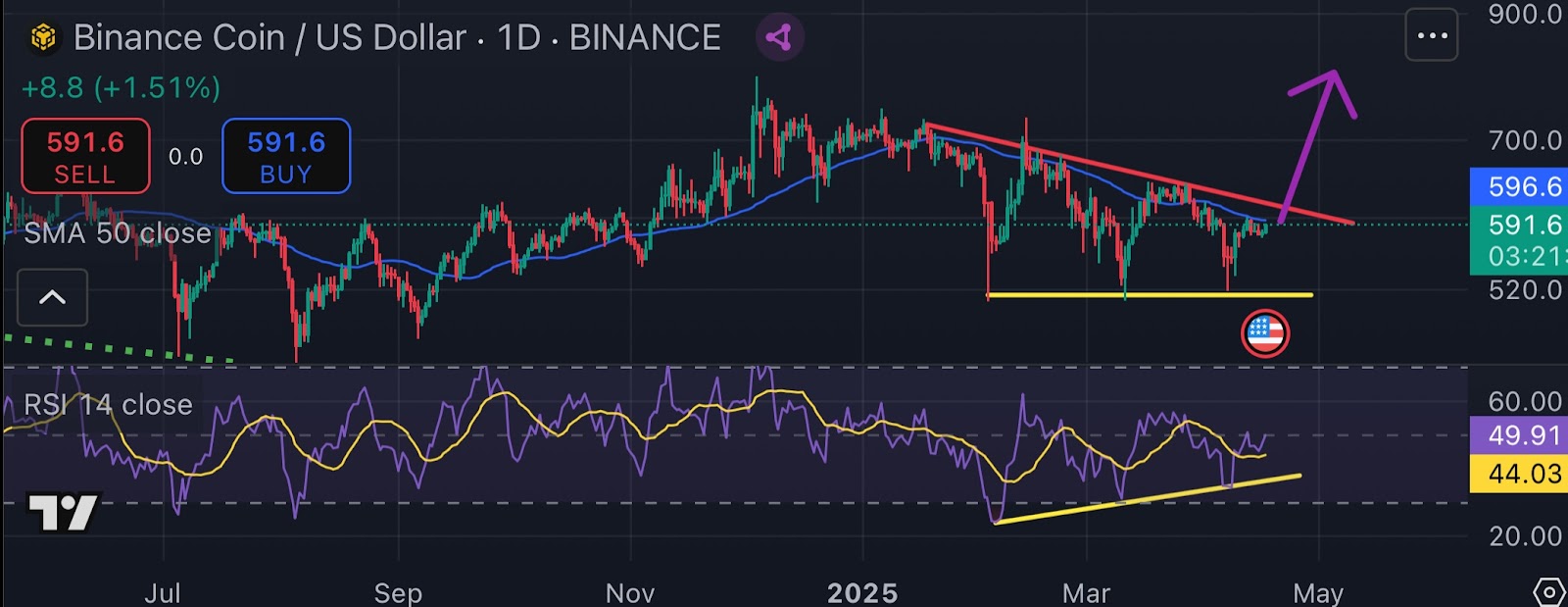 In the daily timeframe, BNB price has been forming a potential reversal pattern since the second inauguration of Trump. Notably, BNB price has established a robust support level above $520, coupled with a bullish divergence of the Relative Strength Index (RSI).