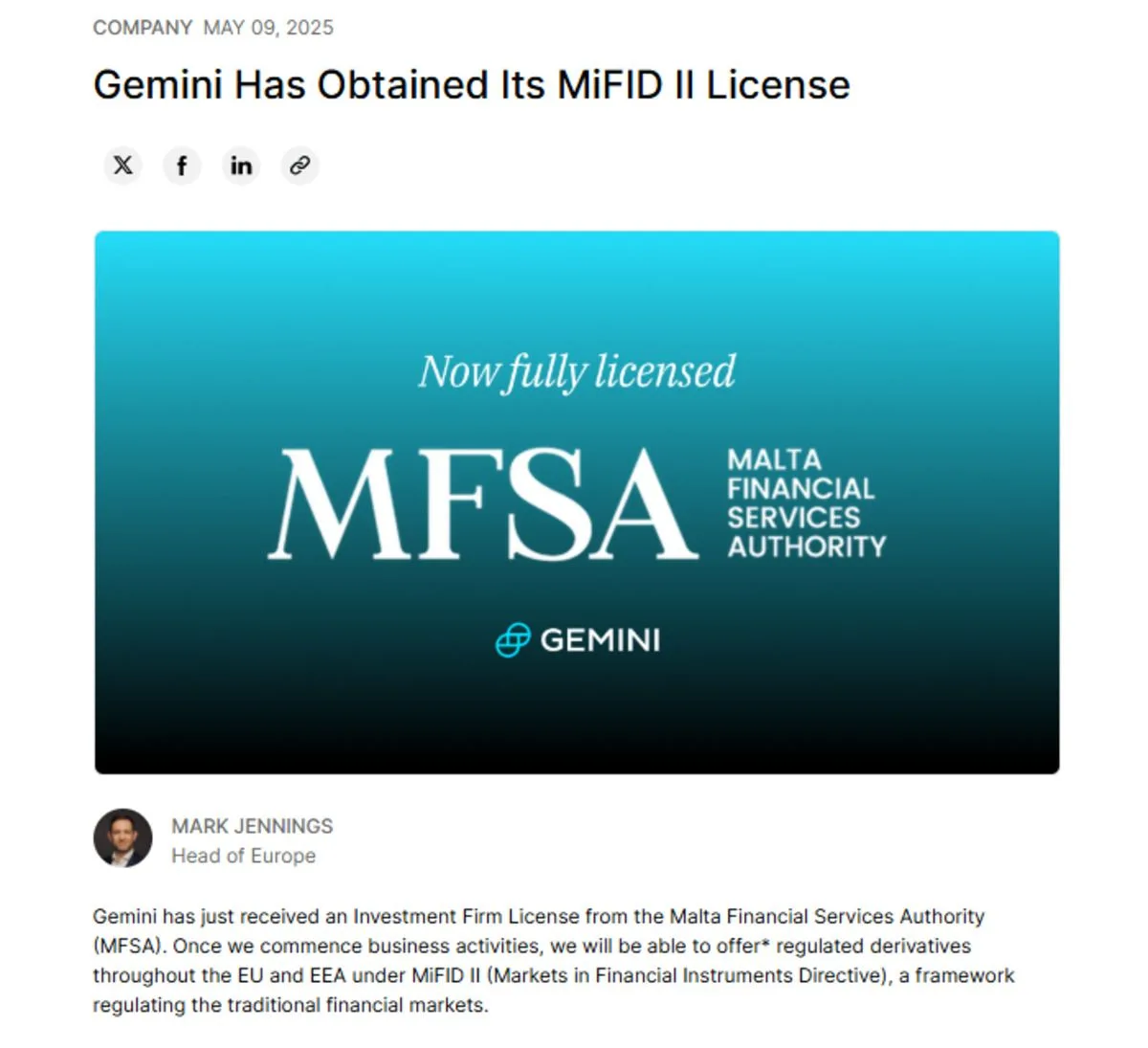 Mark Jennings, Gemini’s head of Europe, stated that this regulatory milestone moves the firm a lot closer to launching derivatives products for both retail and institutional users in the region. The license was issued to Gemini’s Maltese subsidiary, Gemini Intergalactic EU Artemis, on May 8.