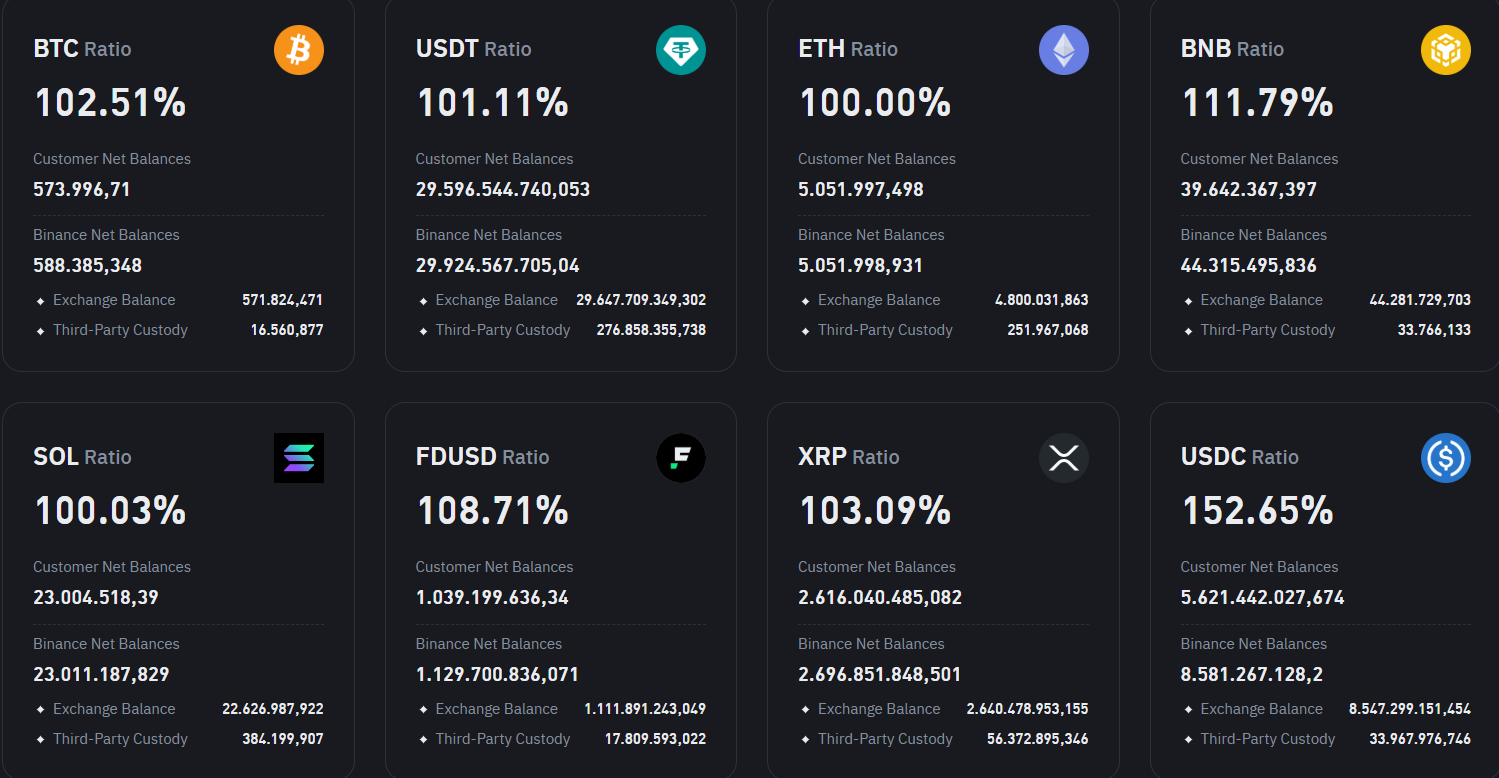 According to Binance’s official website, the reserve ratio (Binance holdings divided by user assets) for major cryptocurrencies is overcollateralized.