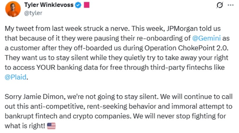 “My tweet from last week struck a nerve. This week, JPMorgan told us that because of it they were pausing their re-onboarding of Gemini as a customer,” Winklevoss wrote on X.