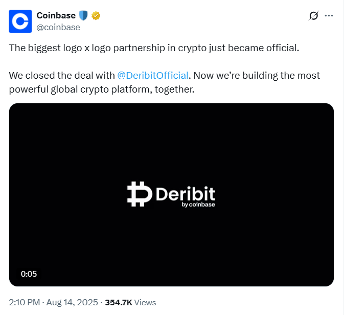 Coinbase confirmed on August 14, 2025, that it had completed the purchase of Deribit for $2.9 billion.