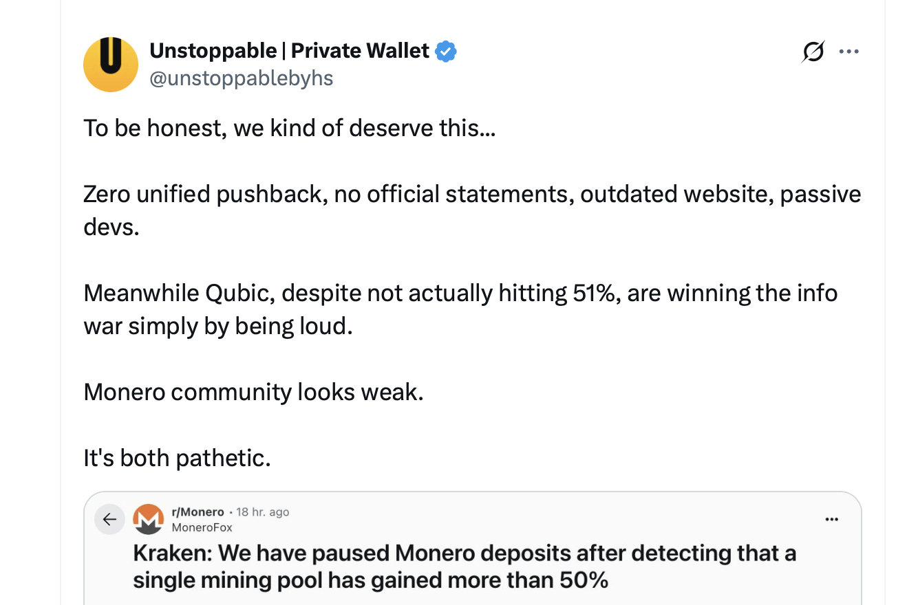 Supporters of XMR have pushed back, calling Qubic’s claim inflated or outright fabricated. They point to mismatches between the pool’s reported hashrate and its actual block production, the absence of any confirmed double-spend, and frame the episode as a marketing ploy rather than a lasting threat. Even so, reports of blockchain reorganizations continue. Moreover, Kraken has judged the situation serious enough to suspend XMR deposits.