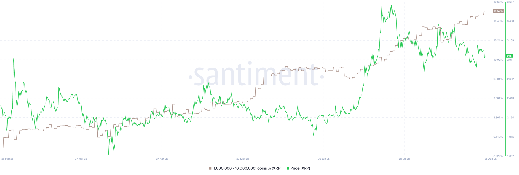 However, on-chain data from Santiment shows accumulation among large holders, with wallets holding between 1 million and 10 million XRP now controlling about 10.6% of the total supply, up from 9.8% in July and 9.14% in March. Analysts suggest continued whale buying could tighten supply and drive a breakout above the $3.00 resistance level.