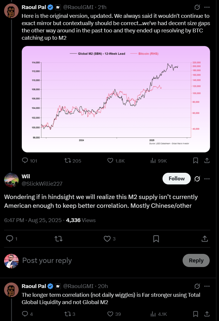 That said, as Real Vision founder Raoul Pal — one of the first to highlight the relationship — noted, the longer-term correlation is stronger when measured against total global liquidity, rather than M2 alone.