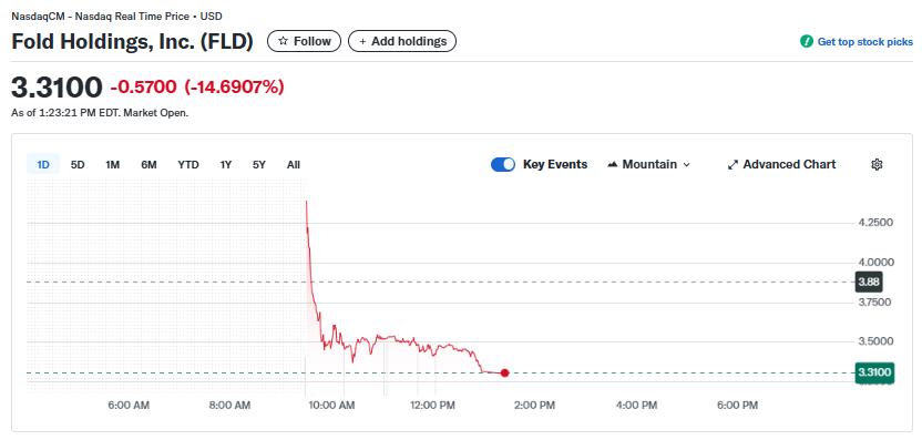 Graphic of price for the shares of Fold Holdings, Inc. Source: Yahoo! Finance