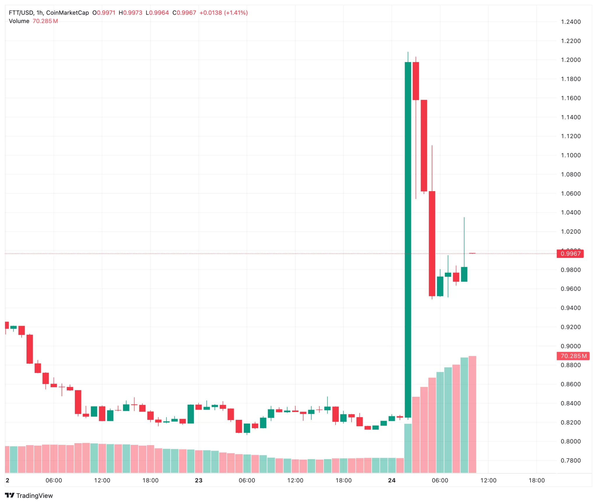 The price of FTT surged significantly within minutes, rising 45% in the hourly candle immediately following the post. FTT briefly rose above $1.
