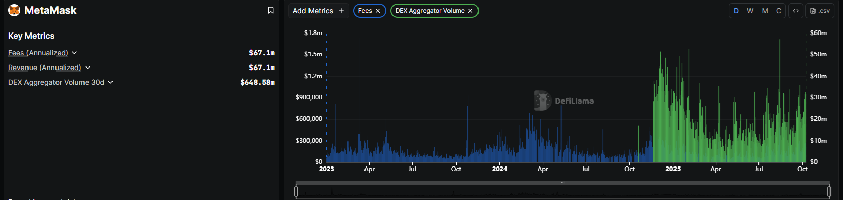 MetaMask has always generated fees even from regular usage. However, in 2025, MetaMask got a boost from routing fees. The wallet carries over $31M in DEX aggregator volume daily, with over $270K in fees.