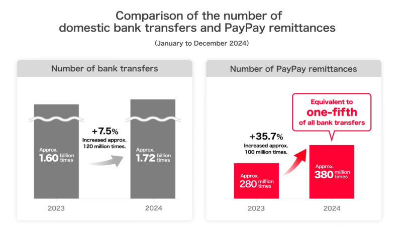 PayPay processed at least 380 million remittances in 2024, a 36% increase from the 280 million transactions it processed in 2023, according to the company. This growth positions PayPay as one of Japan’s leading payment platforms, as bank transfer volumes rose by only 7.5% over the same period.