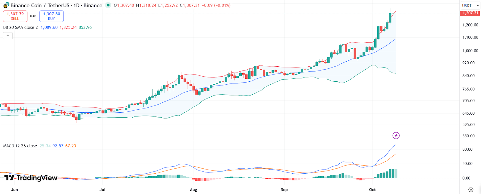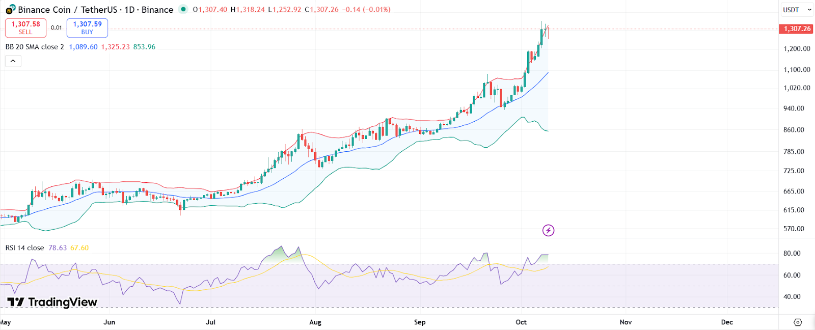 The daily BNB price chart shows strong bullish momentum but also early signs of potential exhaustion. The Bollinger Bands are widening, with price action currently near the upper band, a zone often linked to short-term overbought conditions.