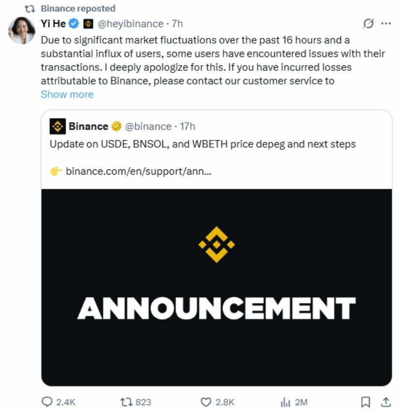 Binance co-founder Yi He apologized to users on Saturday morning. She explained that problems arose from extreme market volatility combined with a huge influx of users to the platform. This caused the exchange’s systems to experience performance issues.