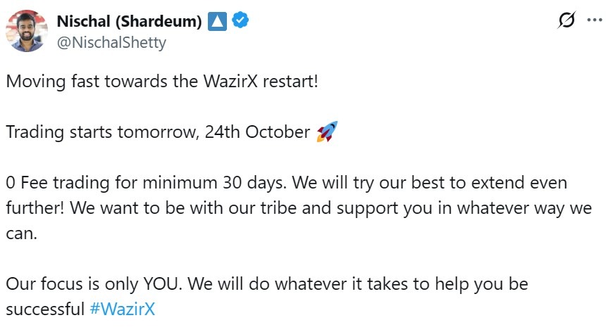 WazirX CEO Nischal Shetty said in a Thursday announcement that the company will relaunch trading Friday, offering zero trading fees for at least 30 days as part of a phased reboot.