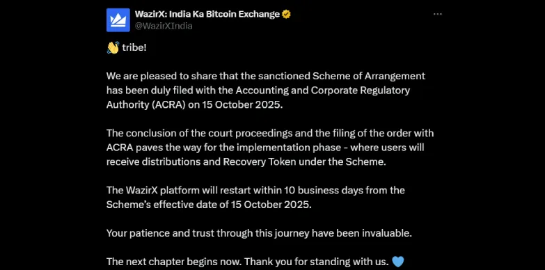 The recovery plan proposed by WazirX’s parent company Zettai Pte Ltd, was approved on October 13, 2025 by the Singapore High Court. This decision ended months of creditor talks and legal procedures. More than 95% of creditors by number and 94.6% by value supported the plan, and the plan was filed with the ARCA on October 15.