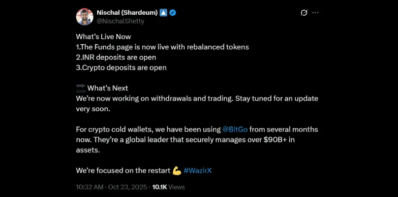 WazirX, an Indian cryptocurrency exchange that was hacked in 2024, has officially entered its relaunch phase as reported yesterday, October 22, 2025, through social media platform X (formerly known as Twitter). The platform’s CEO Nischal Shetty, posted on X today, October 23, 2025 and confirmed that the Funds page is now live, and both INR and crypto deposits are open. With this post, he also provided a brief on what the platform is currently working on.