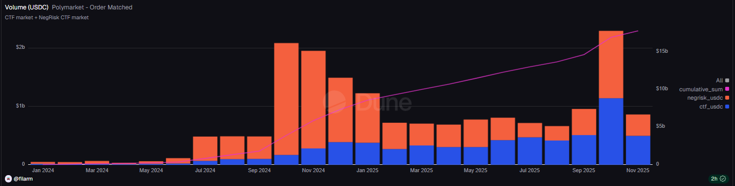 Polymarket continued to show increased user interest, especially from newcomer wallets. In November, the app saw $864M in cumulative volumes, close to the entire month of September.