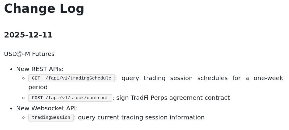 Binance’s changelog notes that on Thursday, the exchange introduced three new API endpoints, one of which — with a URL including stock/contract — allows users to “sign [a] TradFi-Perps agreement contract.” The two other endpoints introduced on the same day allow users to query “trading session schedules for a one-week period” or “current trading session information.”