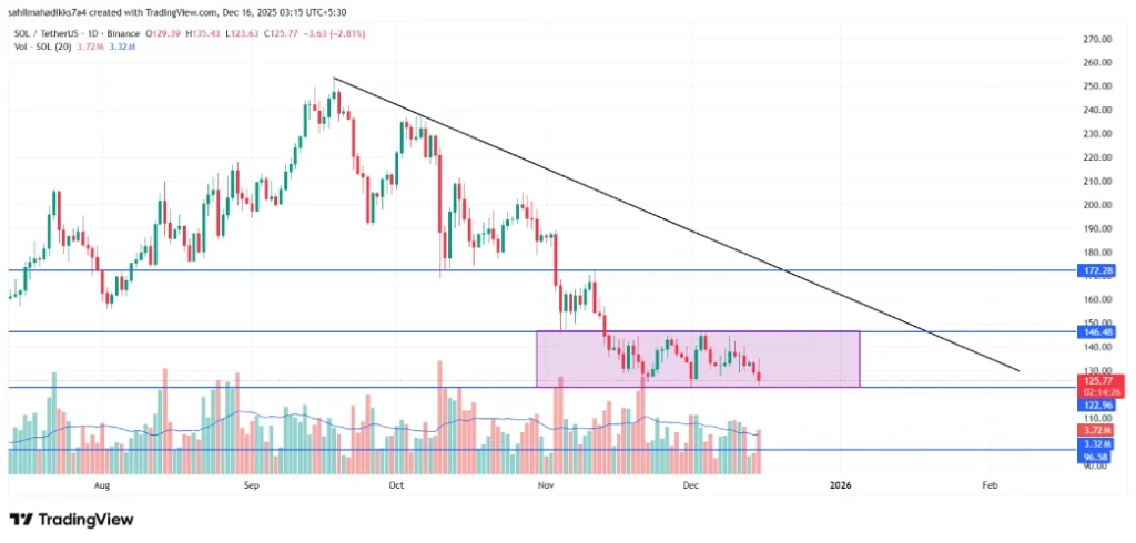 - The Solana price reflects market uncertainty with a tight consolidation within the $146.5 and $125 range.