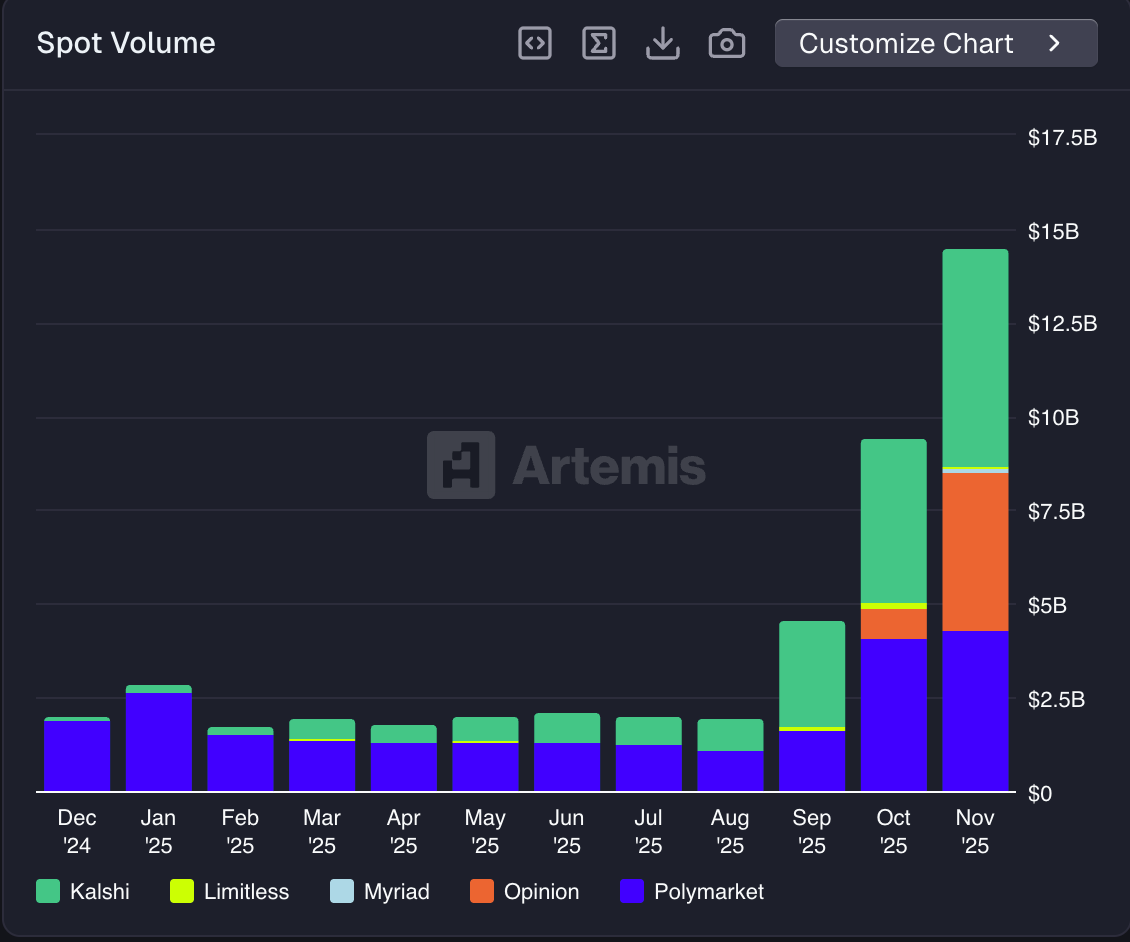 Meanwhile, data from Artemis shows even higher volumes, with total spot volume for the sector reaching as high as $14.5 billion last month, setting new records for both Polymarket and Kalshi, up from $9.4 billion in October.