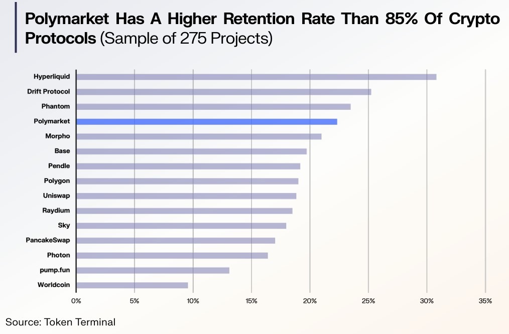 According to the report, which sampled 275 crypto projects spanning networks, decentralized finance (DeFi) platforms, wallets and trading apps, Polymarket’s average retention outperformed over 85% of protocols.