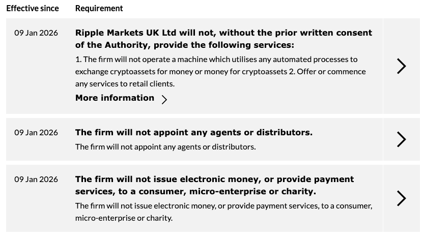 “Ripple Markets UK will not, without the prior written consent of the authority,” provide services involving crypto ATMs, “offer or commence any services to retail clients,” or appoint any agents or distributors, according to FCA records.