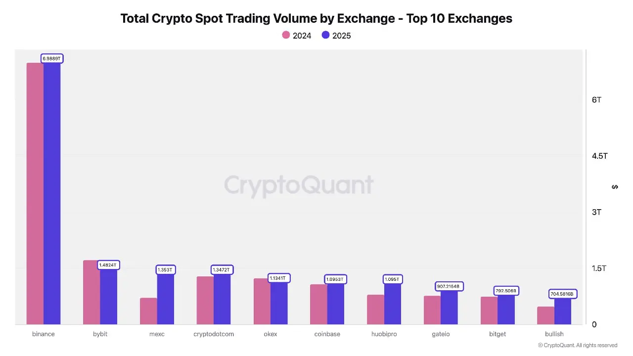 According to CryptoQuant, the remaining platforms, including Coinbase, together contributed almost 10% of Bitcoin permanent volume. The analytics platform revealed that the majority of spot trading activity was concentrated in a few major venues. Binance reported about $7 trillion in spot trading volume in the FY of last year. The $7 trillion accounted for 41% of the total of the top 10 exchanges.