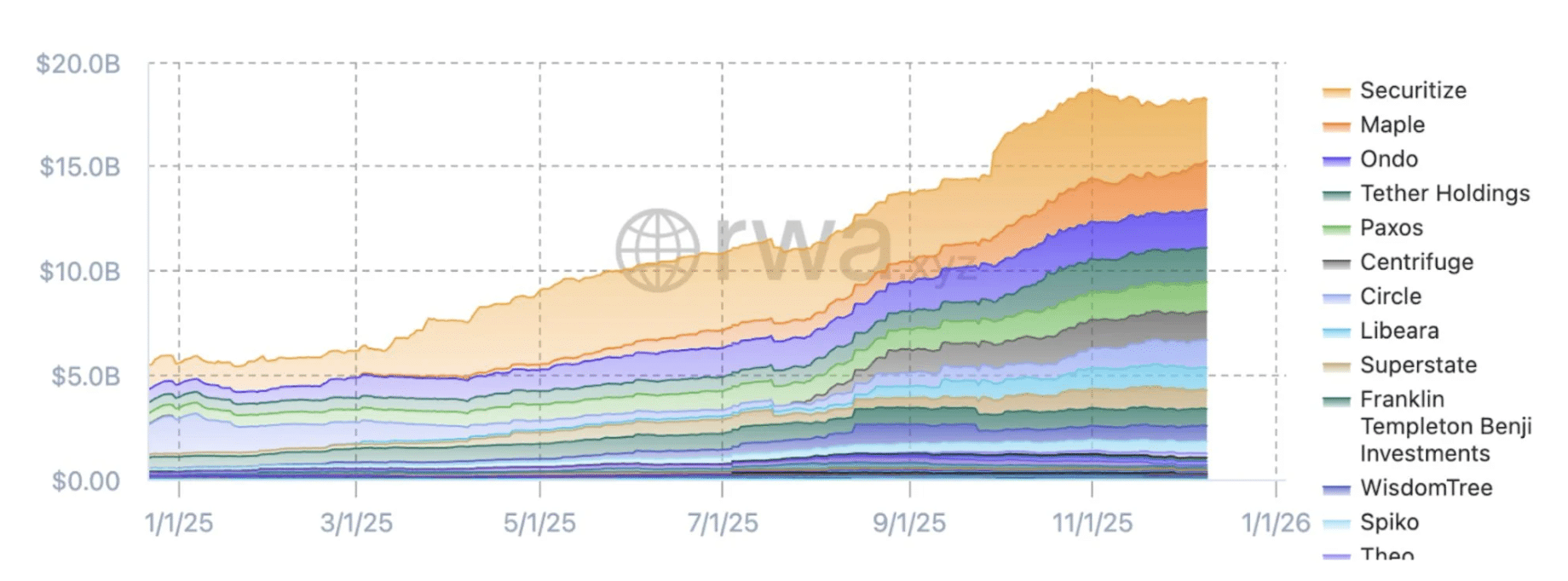 According to Securitize, tokenized real-world assets have passed the $20 billion mark for cumulative asset value. Excluding stablecoins, the sector grew to $18.2 billion by the end of 2025, up from about $5.5 billion at the start of the year. Tokenized treasuries went from $4 billion to $9 billion in the same period.