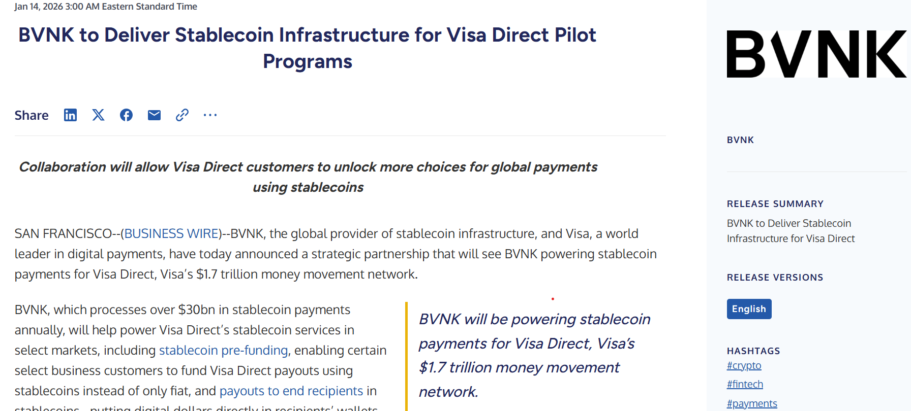 Visa has chosen United Kingdom‑based stablecoin infrastructure provider BVNK to power new Visa Direct pilots, allowing some business customers to pre‑fund cross‑border payouts in stablecoins and deliver digital US dollars directly to recipients’ wallets in select markets.