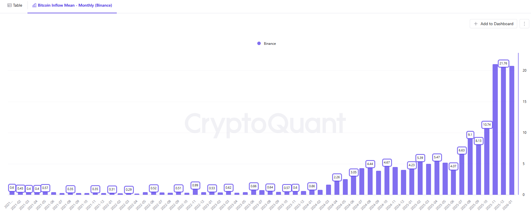 Whale deposits to Binance slowed down in January, after more substantial transfers in December. At the start of 2026, around 15,800 BTC were sent to the exchange, signalling a slower pace of deposits.